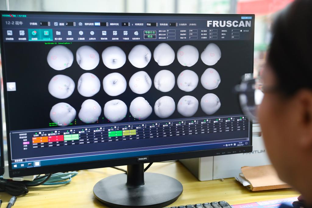 礼县苹果产业发展集团有限责任公司工作人员通过红外光谱识别苹果内部品质。新华社记者 郎兵兵 摄