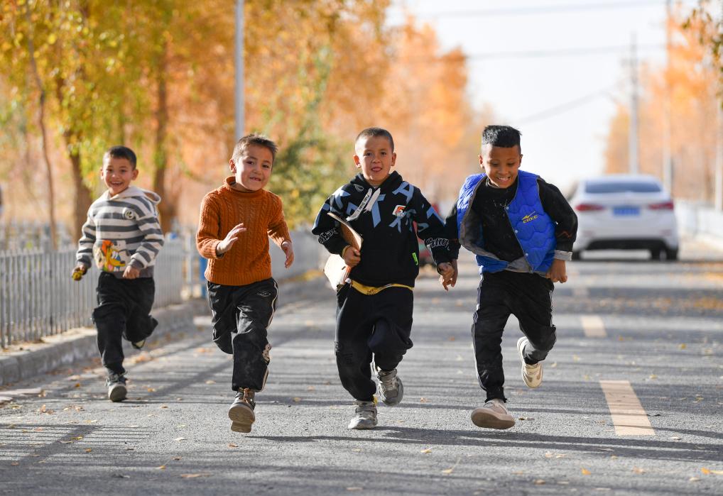 小朋友奔跑在新疆于田县达里雅布依新村(2024年11月9日摄)。