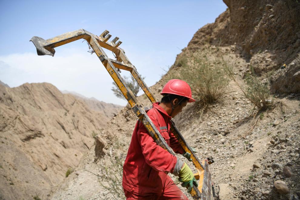 电力工人在新疆塔什库尔干塔吉克自治县的深山中安装用于放线的零件(2019年11月23日摄)。