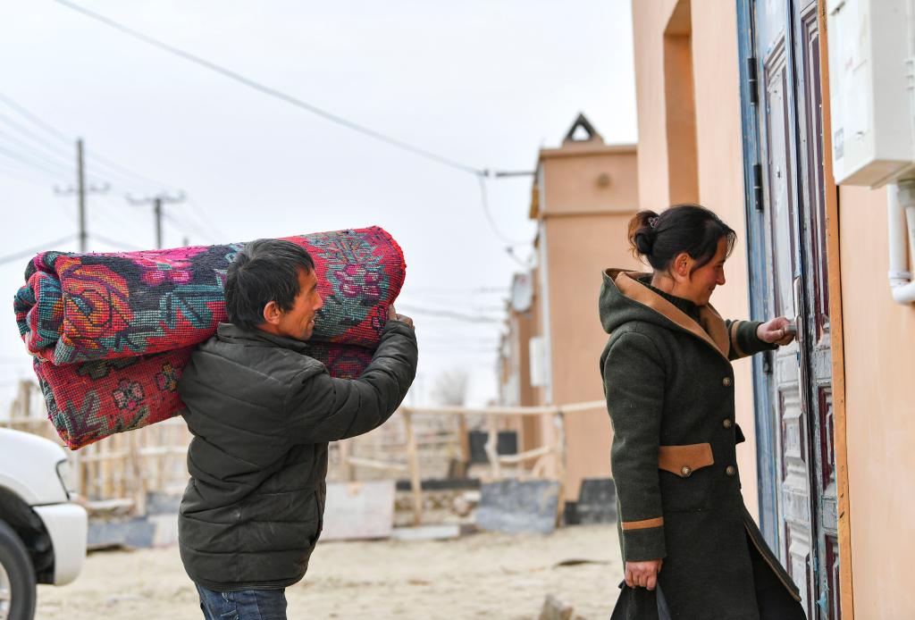 依明·买提库尔班(前)和妻子抬着行李跨出老家的篱笆墙,准备乘车前往安置点(2019年11月17日摄)。