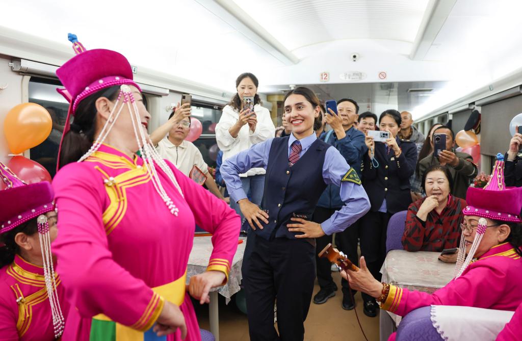 在由喀什开往成都西的列车上,艾尔开牙·多力开与民间艺人一起为乘客跳舞(2024年4月19日摄)。
