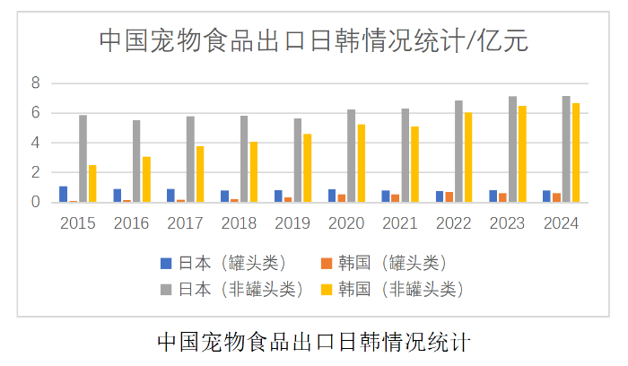 王金全分析认为,日韩是我国宠物食品重要出口地,2022年占出口总额12%,中国品牌凭性价比与差异化切入日本市场,2024年对韩非罐装类出口额较2015年翻倍。