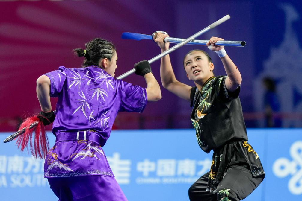 11月10日,山东队选手孙守诺、于文珂在团体赛女子二人器械(含徒手与器械)对练比赛中。最终,山东队夺得金牌。新华社记者 晋美多吉 摄