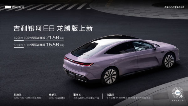 4月15日,吉利汽车在吉利钱塘基地举办吉利银河E8挑战城市赛道第二站-赛博工厂龙腾赛道活动,现场正式发布了吉利银河E8两款全新版型“550km 400V两驱龙腾版“及“620km 800V四驱龙腾版”,分别售价16.58万元、21.58万元。为了能让更多用户轻松拥有吉利银河E8,即日起截至4月底,全系车型均可享受限时权益2000抵7000膨胀礼,价值6000元升舱礼,以及包括置换礼、金融礼、质保礼、流量礼和交付礼在内的5大权益。