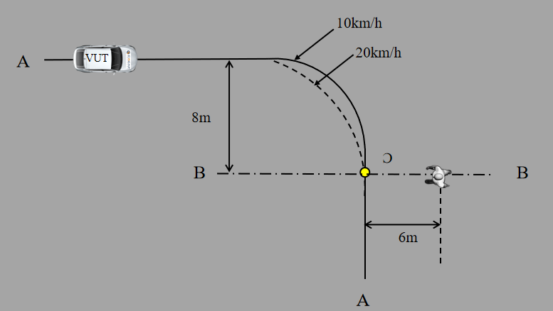 CPTA-LN场景下,行人以5km/h的速度自相对车辆行驶方向的右侧向左侧移动。VUT分别以10km/h、20km/h、30km/h的速度左转测试。碰撞位置在50%处。