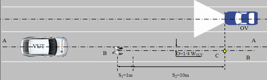 CSTA-LN场景下踏板摩托车以20km/h的速度以与车辆行驶方向相反的方向移动。VUT分别以10km/h、20km/h、30km/h的速度测试。碰撞位置在50%处。该场景主要考察车辆系统在左转弯过程中,对相邻车道对向驶来的踏板摩托车的识别及响应能力。