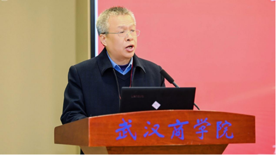 江汉大学党委宣传部常务副部长范雄飞作主旨报告。图片来源:武汉商学院