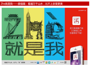 整个策划采用“设问”的方法,第一波传播先提出问题:“ZHE是谁?”制造出悬念,接下来分为三个层面依次解答“ZHE就是我”。“ZHE”这个拼音,作为主要设计点在“颜值篇、根植篇、价值篇”三轮传播中,分别展示的是将浙江的地标性建筑、浙江新闻APP的功能、浙江新闻APP的服务范围,分类别阐发了品牌的内涵与定位。系列设计通过网络和楼宇、公交车灯箱等户外屏幕同步推广,后续又制作代表性人物群像的代言海报,并跟进充满地方特色内容创作,短时间达到了预期效果。