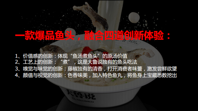 对“大鲁说”的品牌资产梳理后,乐剑峰推导出一个核心战略,寻找大家吃鱼头的一个真正的动机和“大鲁说”这家鱼头给人的最好的价值。经过调研,最终打造出“珍珠藤椒鱼头”菜品。