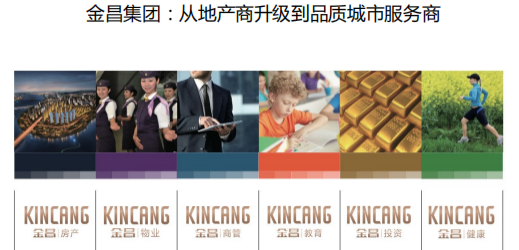 所以,金昌地产集团品牌符号升级分为以下几个阶段。首先,品牌定义要发生改变,地产公司要变成一个品质城市的综合服务商,要用一个更大的概念去诠释品牌的核心定义。其次,要用非图形化的标志去涵盖子板块。多元化经营的集团,就必须要用文字标,这是第一步;第二步,因为金昌中文品牌的使用存在着将来有可能的法律风险,所以主打英文名字,所以对英文名字进行了重新地发掘, king跟金有谐音,cang就是昌的谐音,所以最后注册了kincang;第三步,对它的子板块进行色彩上的划分,金昌房产、金昌物业、金昌商管、金昌教育,用kincang来进行一个统领。每一个版块去推广的时候,它是自己的,合起来的时候又能形成一个合力,这就是品牌架构的作用。