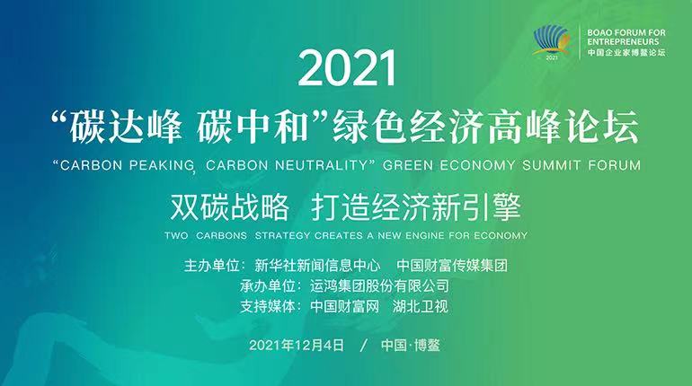 12月4日,2021中国企业家博鳌论坛·“碳达峰 碳中和”绿色经济高峰论坛在博鳌举行。此次论坛的主题为“‘双碳’战略,打造经济新引擎”,来自国内外的产学研界嘉宾共同分析中国经济内生动力,探讨中国经济绿色发展、高质量发展之路。论坛由新华社新闻信息中心和中国财富传媒集团联合主办,运鸿集团股份有限公司承办,中国财富网和湖北卫视做媒体支持。