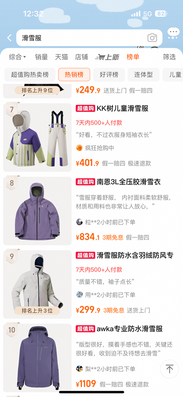天猫“双旦”礼遇季期间,国产品牌ISEE MIGGA成交同比增长超500%,awka 3L滑雪服单日卖2000多件。在天猫滑雪服销量榜(截至2024年12月31日)前10名中,7个均为国产品牌。