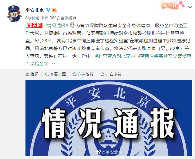 為有效保障群眾生命安全和身體健康,服務全市防疫工作大局,衛健會同市場監管、公安等部門持續對全市核酸檢測機構進行督查檢查。5月28日,發現“北京中同藍博醫學檢驗實驗室”在核酸檢測過程中涉嫌違法犯罪。目前北京警方已對該實驗室立案偵查,將法定代表人張某某(男,52歲)等人查獲,案件正在進一步工作中。