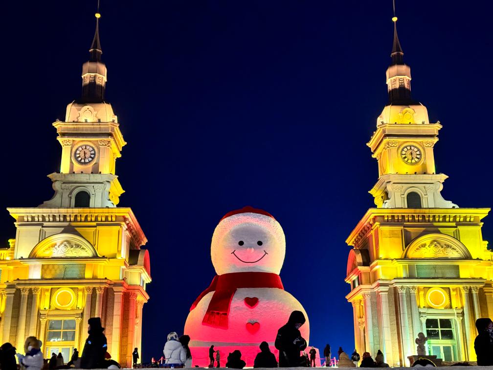 在道里區(qū)音樂長廊,約18米高的網(wǎng)紅大雪人頭戴紅帽子,扎著紅圍巾,笑盈盈地和人們“問好”,吸引眾多市民與游客參觀。每年冬天,網(wǎng)紅大雪人都為哈爾濱增添一份浪漫與童趣。