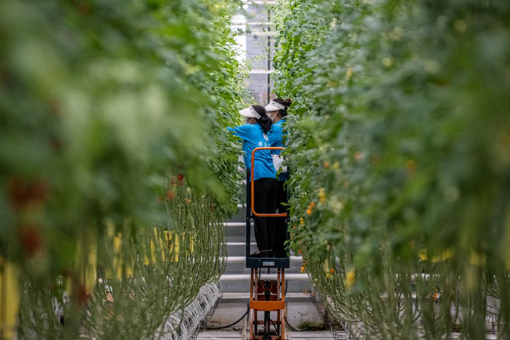 在吉林卓远农业发展有限公司的“植物工厂”内,员工正在采摘成熟的水果番茄(7月15日摄)。新华社记者 邵泽东 摄