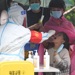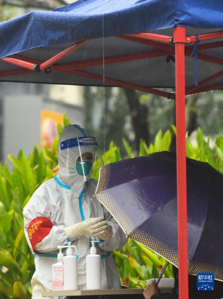 4月1日,在海口市龍華區金貿街道國貿社區新冠肺炎核酸采樣點,居民接受核酸采樣。