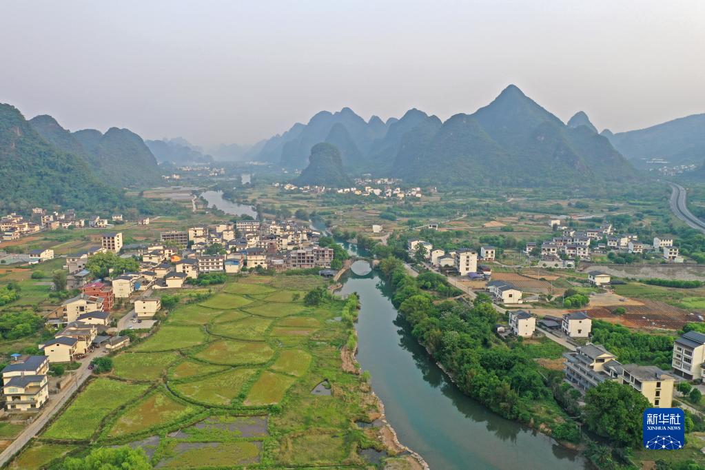春意日濃,廣西桂林市陽朔縣遇龍河沿岸山清水碧,田園斑斕,宛如一幅幅山水田園畫卷。