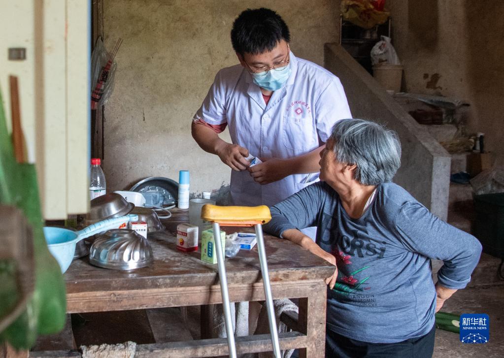 7月1日,村醫胡嘯(左)在村民家中問診。
