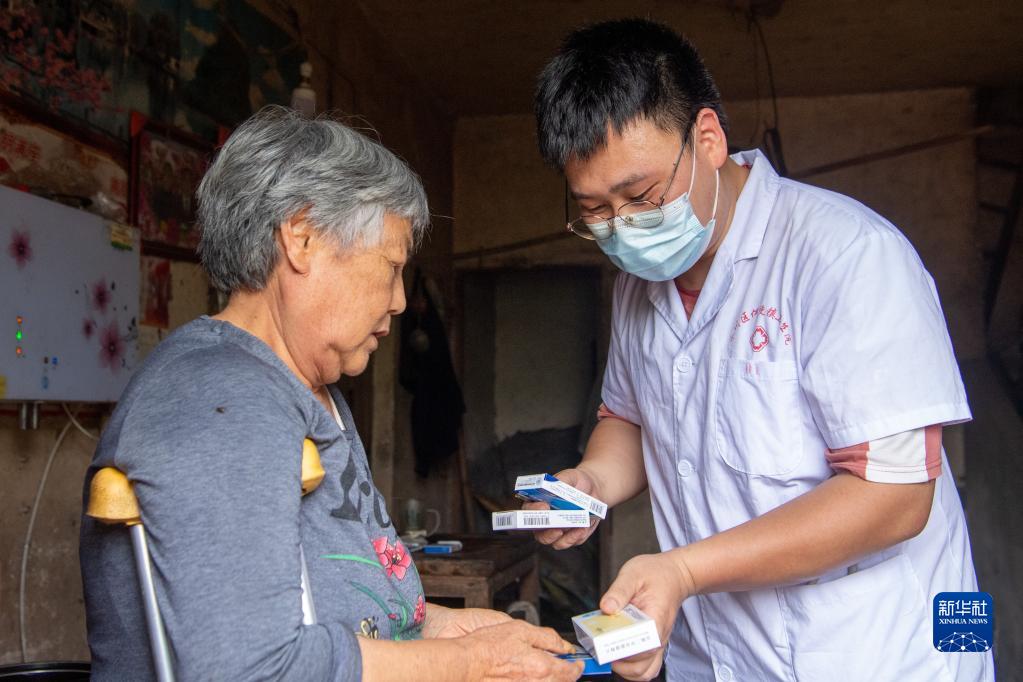 7月1日,村醫(yī)胡嘯(右)在一名村民家中為她講解藥品的服用方法。