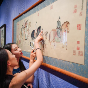 6月6日,在东台西溪天仙缘景区内的东台发绣展示馆,游客观赏、讨论发绣作品《虢国夫人游春图》。