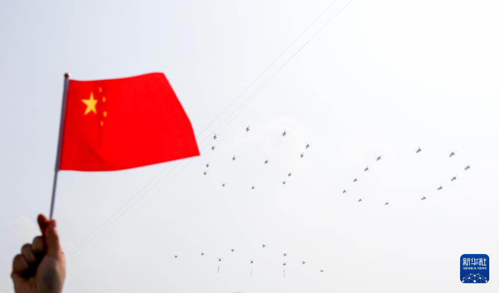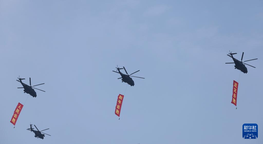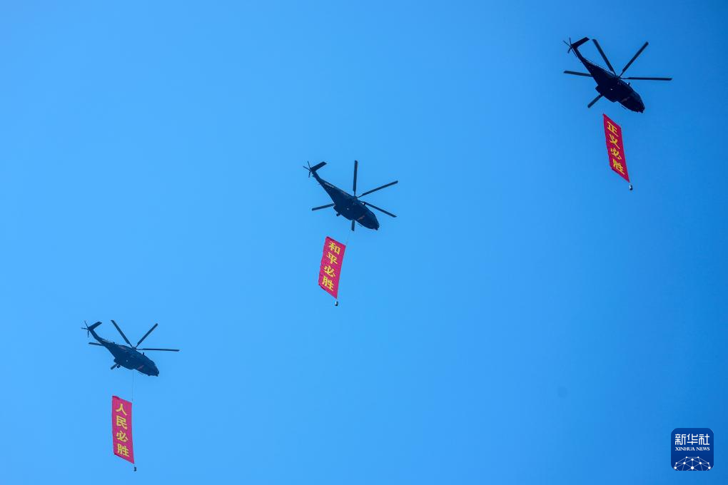 9月3日,纪念中国人民抗日战争暨世界反法西斯战争胜利80周年大会在北京隆重举行。这是空中护旗梯队飞过天安门广场上空,26架直升机汇成巨大的“80”字样。