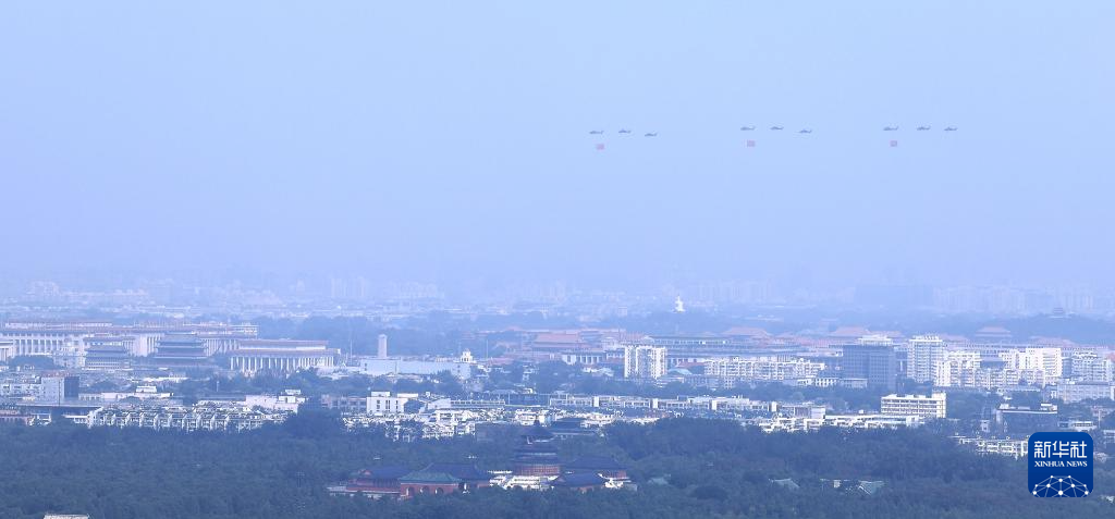 9月3日,纪念中国人民抗日战争暨世界反法西斯战争胜利80周年大会在北京隆重举行。这是空中护旗梯队飞过天安门广场上空。