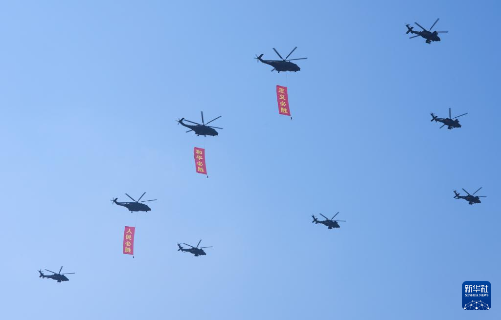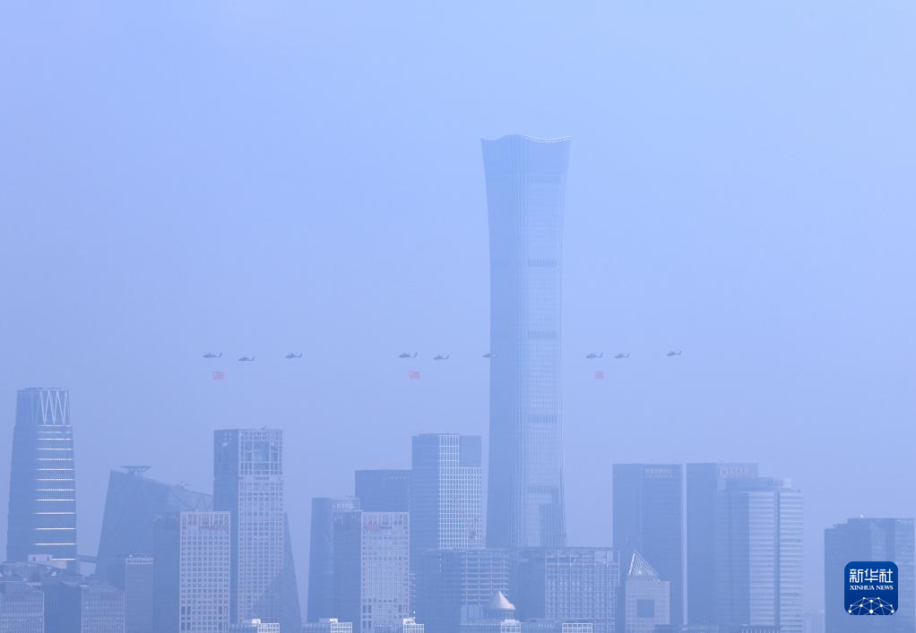9月3日,纪念中国人民抗日战争暨世界反法西斯战争胜利80周年大会在北京隆重举行。这是空中护旗梯队通过天安门广场。