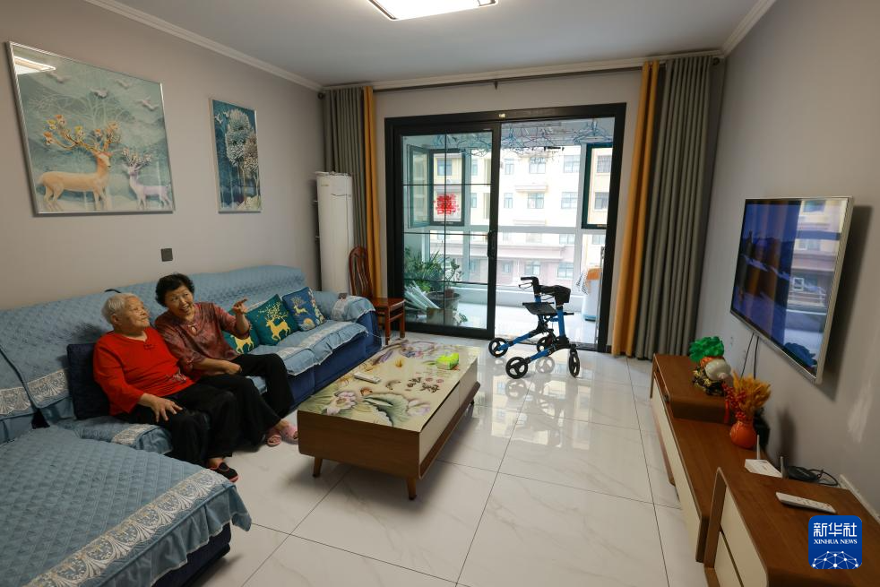 9月3日,在山东省枣庄市薛城区临城街道,老兵郑亚芹(左)和家人一起观看纪念中国人民抗日战争暨世界反法西斯战争胜利80周年大会直播。