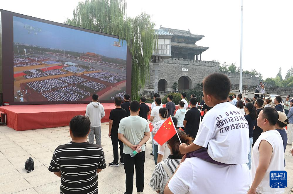 9月3日,游客在山东省枣庄市台儿庄古城西门观看纪念中国人民抗日战争暨世界反法西斯战争胜利80周年大会直播。