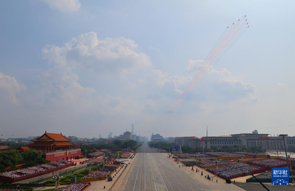 9月3日,纪念中国人民抗日战争暨世界反法西斯战争胜利80周年大会在北京隆重举行。这是空中护旗梯队通过天安门广场。