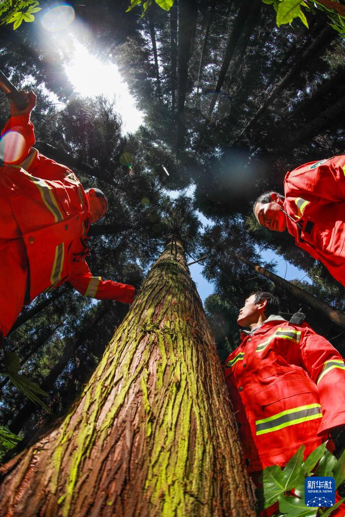 张华(右)与张忠在贵州省毕节市七星关区拱拢坪国有林场查看30多年前栽下的树木长势(11月13日摄)。