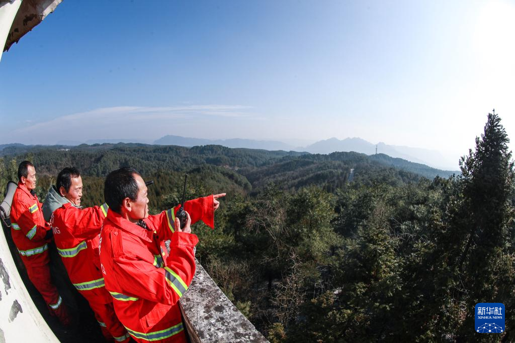 张建(左)、张忠(右)、张华在贵州省毕节市七星关区拱拢坪国有林场的瞭望塔上观察林区动态(2019年1月3日摄)。