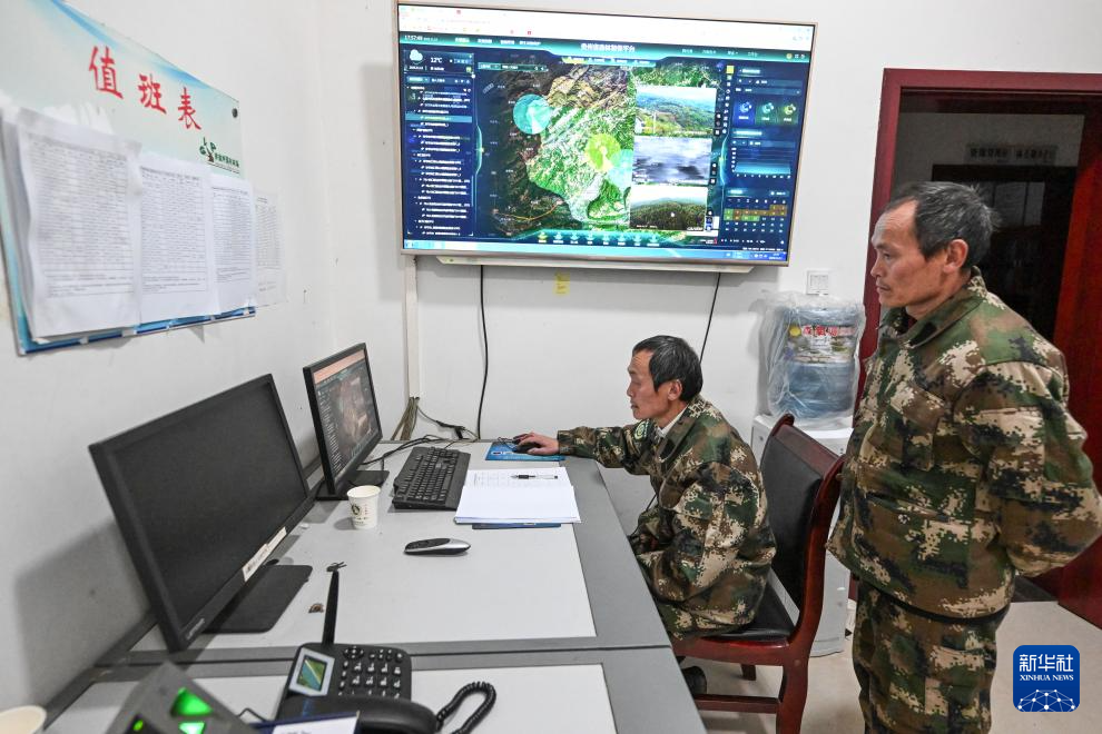 张华(左)、张忠在贵州省毕节市七星关区拱拢坪国有林场值班室查看林区监控情况(11月13日摄)。