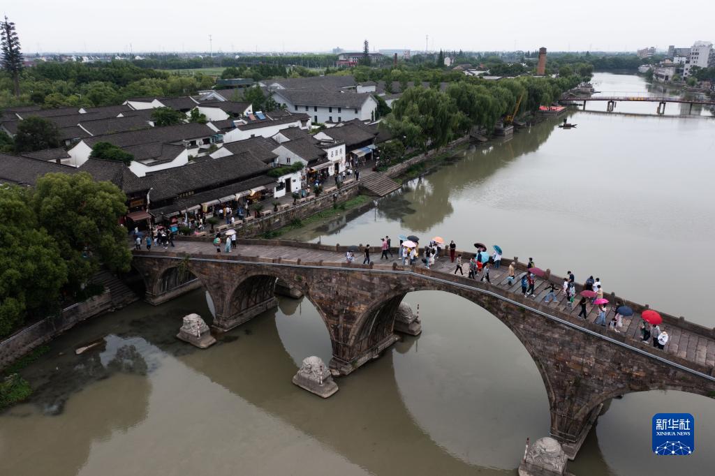 這是5月28日拍攝的經(jīng)過浙江杭州塘棲古鎮(zhèn)的京杭大運河(無人機(jī)照片)。新華社記者 徐昱 攝