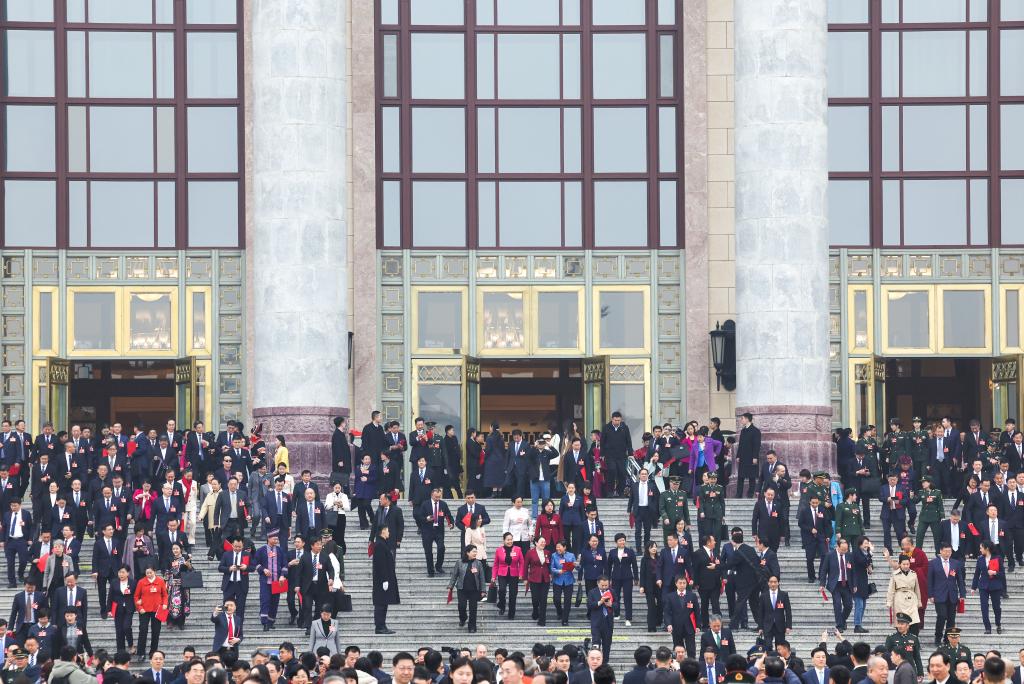 ↑3月10日,全国政协十四届三次会议在北京人民大会堂闭幕。这是闭幕会后,委员们走出人民大会堂。