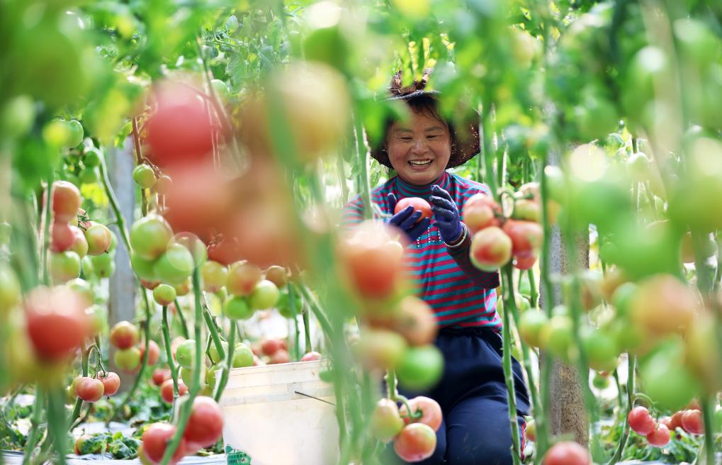 2025年3月8日,山东省临沂市郯城县陵坡村的村民在大棚内采摘西红柿。新华社发(张春雷摄)