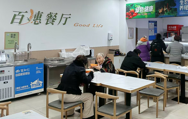 2025年3月8日,在江苏省连云港市海州区新东街道双园社区百穗餐厅,老人们正在享用晚餐。(庄婷婷 摄)