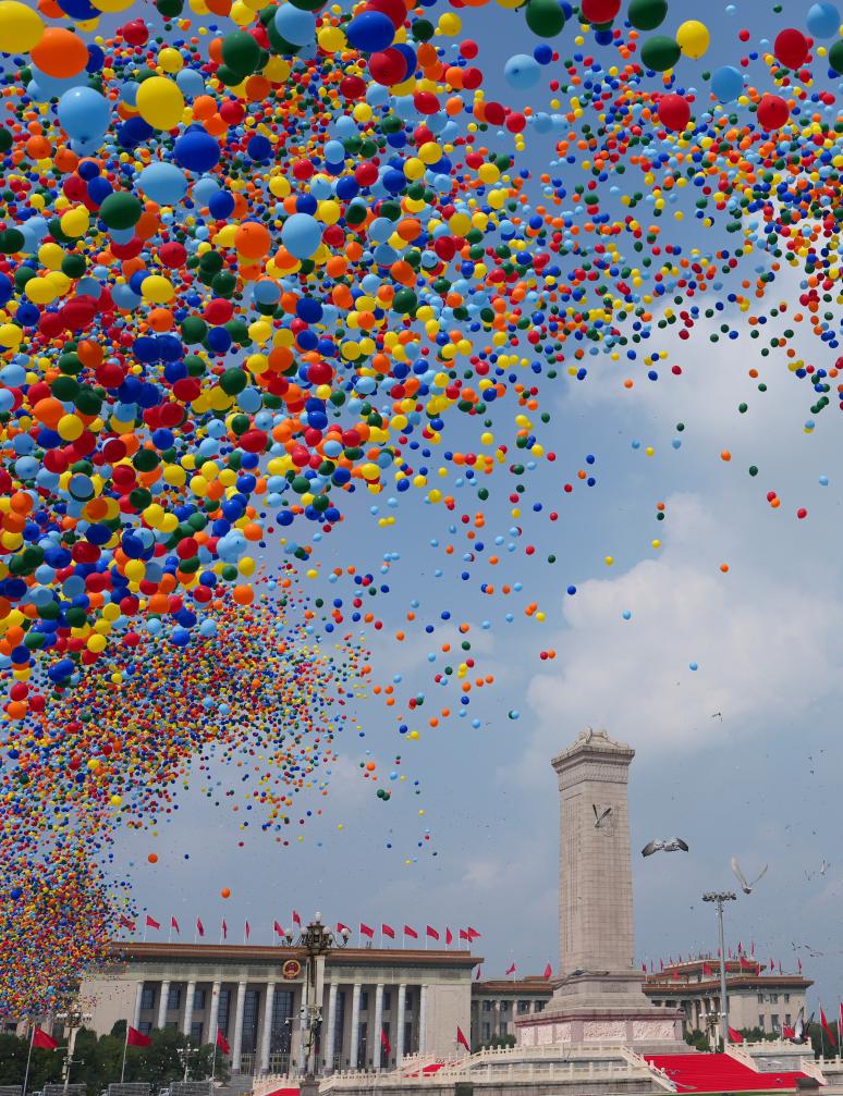 2025年9月3日,纪念中国人民抗日战争暨世界反法西斯战争胜利80周年大会在北京隆重举行。这是纪念大会现场放飞气球和鸽子。新华社记者 牟宇 摄