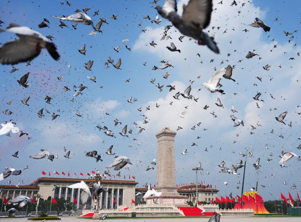 2025年9月3日,纪念中国人民抗日战争暨世界反法西斯战争胜利80周年大会在北京隆重举行。这是纪念大会现场放飞鸽子。新华社记者 牟宇 摄