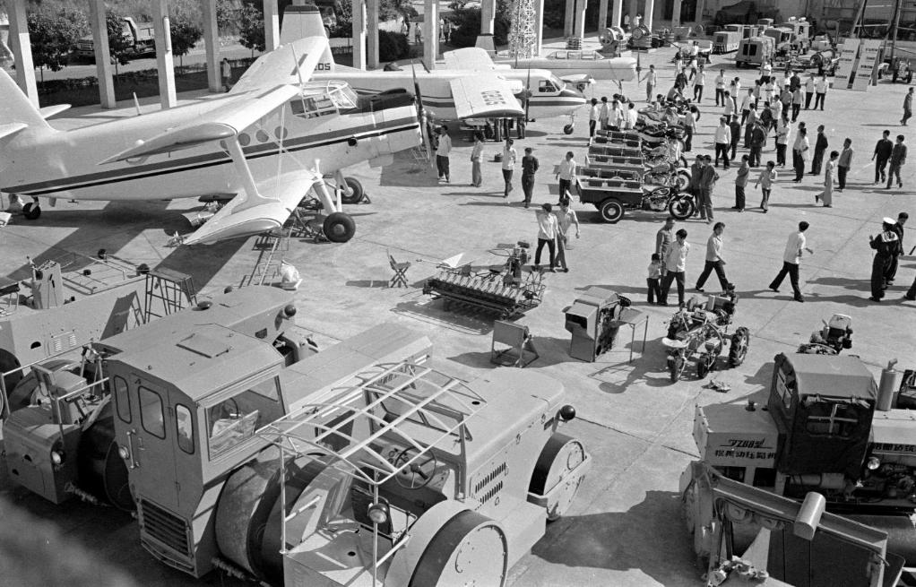 参加1979年秋季中国出口商品交易会的来宾们在广场上参观各种农业机械和农用飞机。
