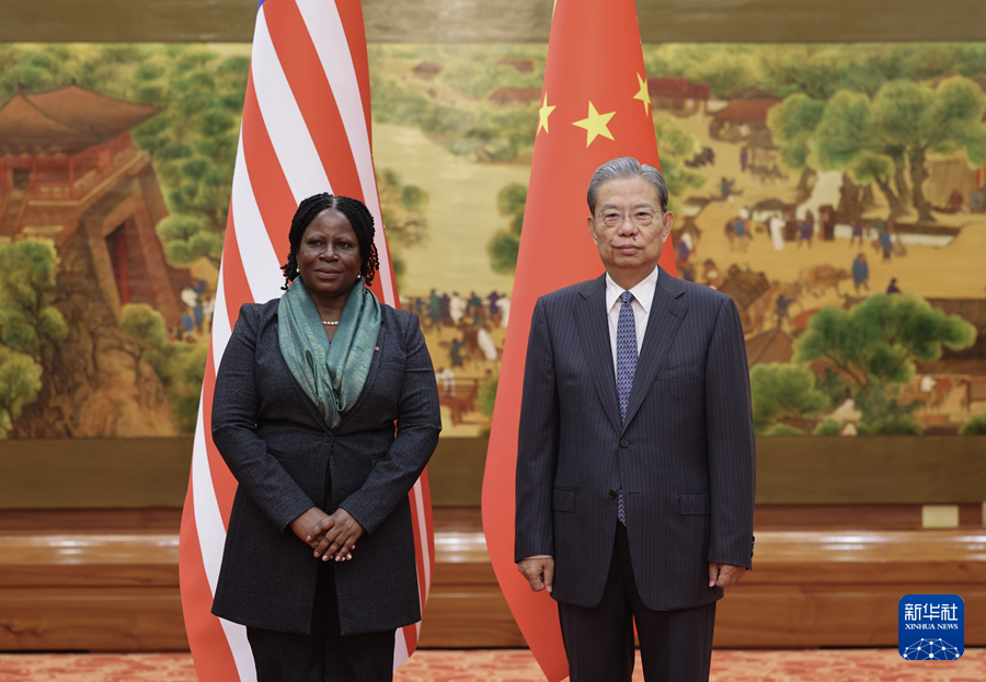 10月15日,全国人大常委会委员长赵乐际在北京会见来华出席全球妇女峰会的利比里亚临时参议长劳伦斯。新华社记者 丁林 摄