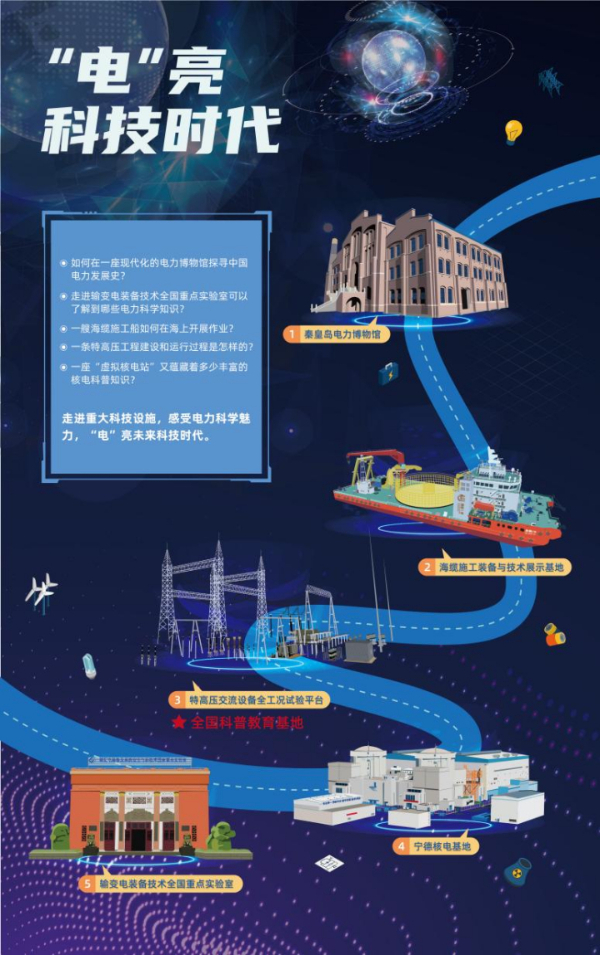 如何在一座现代化的电力博物馆探寻中国电力发展史?走进输变电装备技术全国重点实验室可以了解到哪些电力科学知识?一艘海缆施工船如何在海上开展作业?一条特高压工程建设和运行过程是怎样的?一座“虚拟核电站”又蕴藏着多少丰富的核电科普知识?走进重大科技设施,感受电力科学魅力,“电”亮未来科技时代。