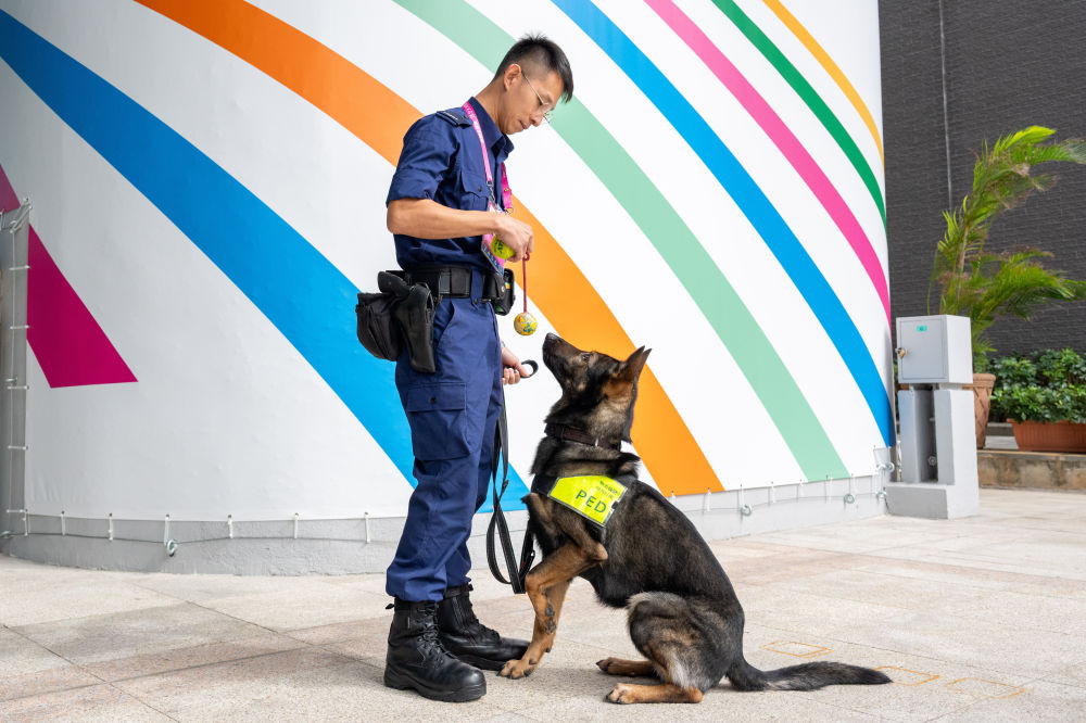 “它刚从学校‘毕业’不久,还在学习,但它特别认真。”它的主人林沛谦,是十五运会香港赛区执行搜爆安保工作的香港警务人员。听到主人的夸奖,Rich仰起头,耳朵竖得笔直,似乎听懂了些什么。