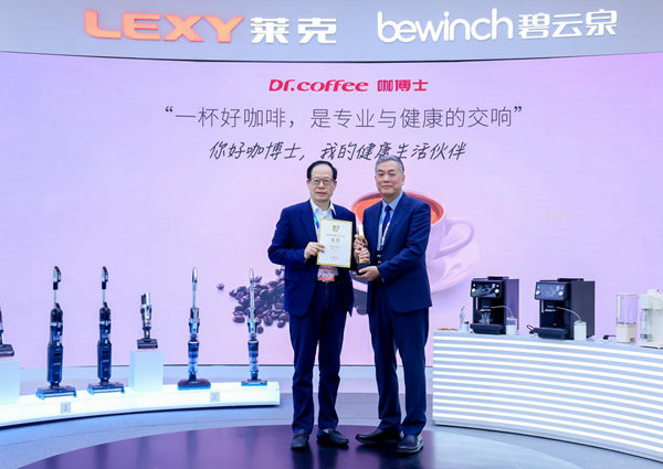 中国家用电器协会理事长陶小年现场宣布,咖博士Grace 200半商用全自动咖啡机从367件申报产品中脱颖而出,获得2025AWE艾普兰奖年度奖项——艾普兰金奖,并向莱克电气董事长倪祖根颁发奖杯。