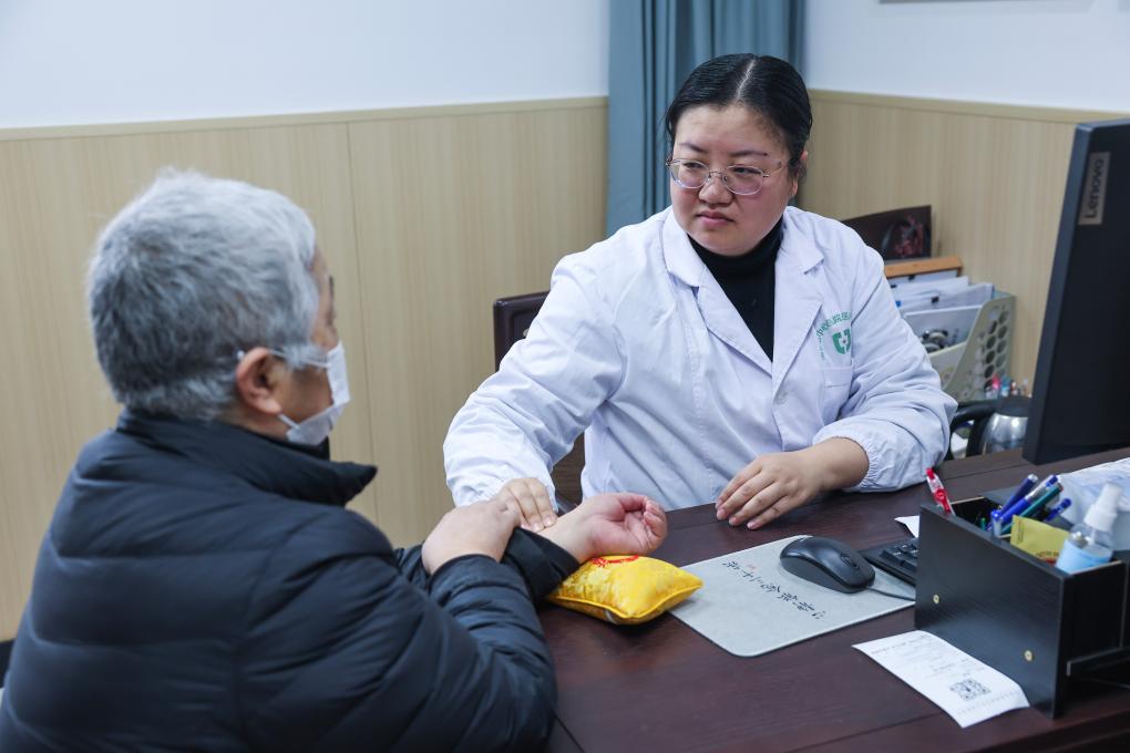 2024年12月13日,在浙江省湖州市环渚龙泉街道社区卫生服务中心中医馆,医生在给老人进行中医诊疗。新华社记者 徐昱 摄