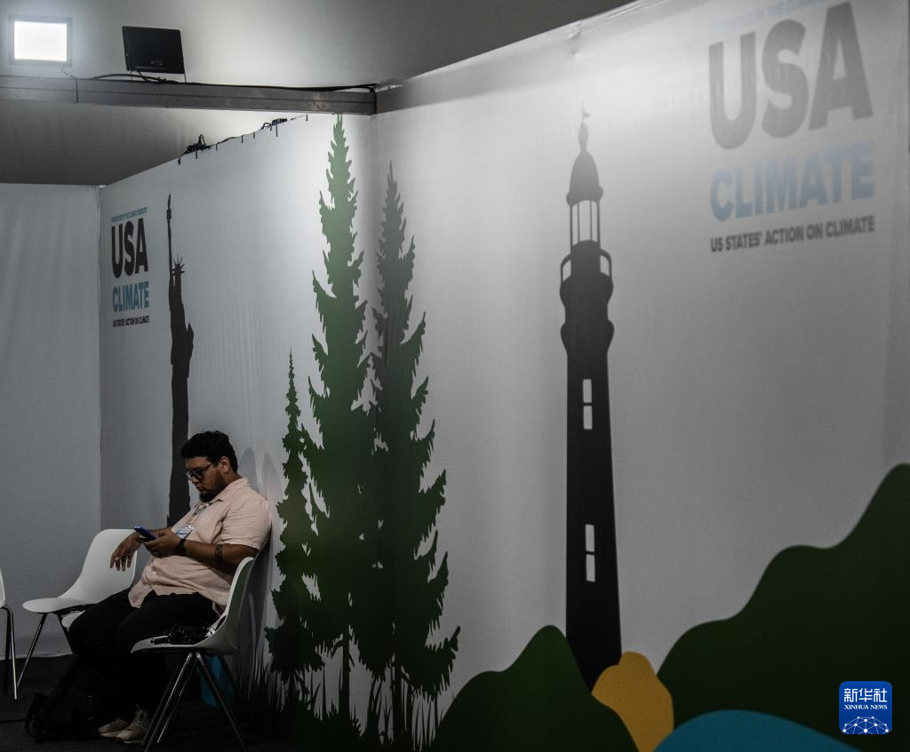 11月17日,在巴西贝伦举行的《联合国气候变化框架公约》第三十次缔约方大会(COP30)上,一名男子坐在“美国馆”内。 新华社记者 王天聪 摄